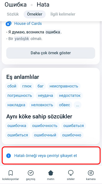 Çeviride veya sözlükte herhangi bir hatayla karşılaştıysanız onu doğrudan siteden şikayet edebilirsiniz. Bunun için Hatalı örneği veya çeviriyi şikayet et butonuna tıklayın, istenilen öğeyi seçin ve Bildirimi gönder'e tıklayın. Önerinizi yorum şeklinde de gönderebilirsiniz.