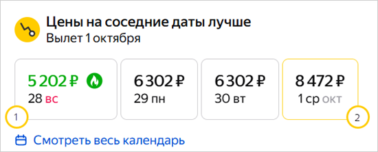 В блоке Цены на соседние даты зеленым цветом выделена самая низкая цена, а желтой рамкой — цена на выбранные даты. Для билетов в оба конца показана их суммарная стоимость.