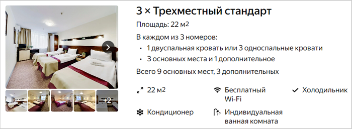 Если перед названием категории номера указано количество, например, 3 × Трехместный стандарт, то можно забронировать несколько номеров в одном заказе.