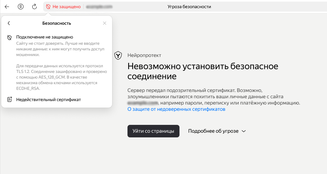 Пример сообщения об ошибке настройки SSL-сертификата в Яндекс Браузере