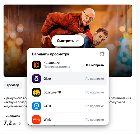 В результатах поиска в карточках фильмов и сериалов может отображаться наличие у пользователя подписки на онлайн-кинотеатр. Такие сервисы показываются выше кинотеатров без подписки, чтобы пользователю было проще найти свой кинотеатр. Если у пользователя несколько подписок, кинотеатры с подпиской показываются в случайном порядке.