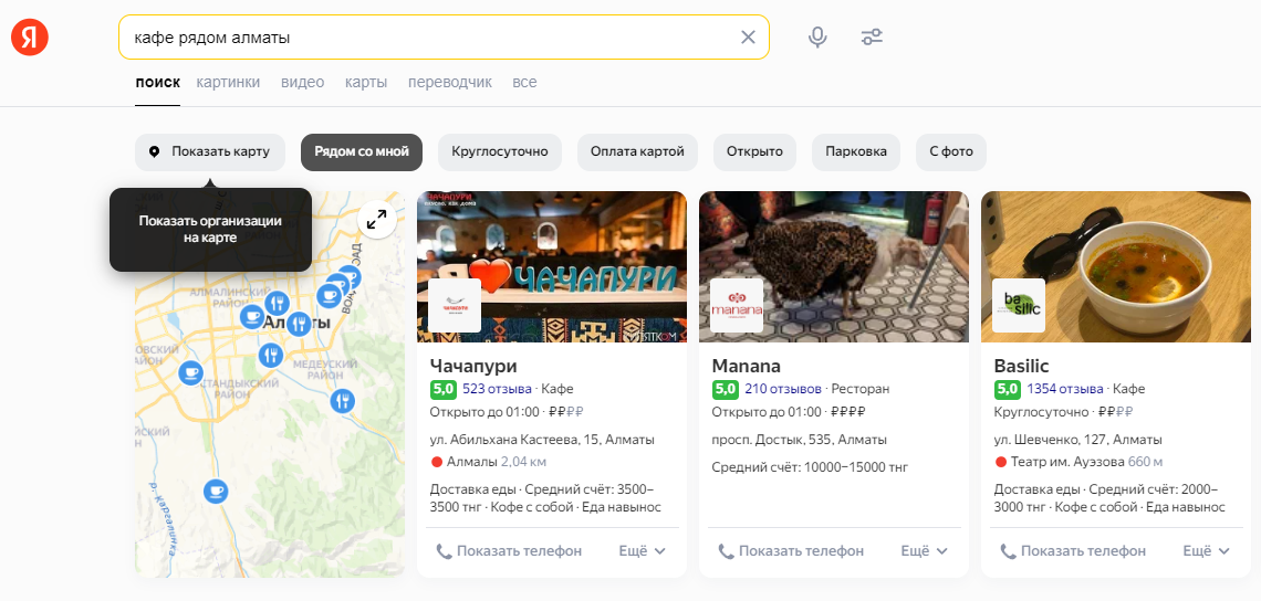 Когда пользователь ищет информацию о расположении или сфере деятельности той или иной организации, Поиск может показать ему карусель из карточек компаний, которые лучше всего соответствуют запросу. Набор фильтров помогает пользователю уточнить запрос и получить еще более релевантный список карточек — например, только организации, расположенные в географической близости.