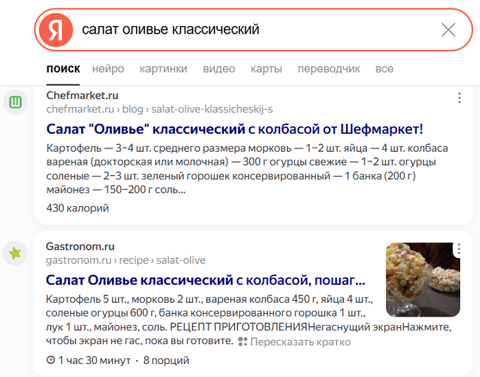 Для формирования такого ответа Яндексу нужны сведения о том, какие фрагменты страницы соответствуют определенным смысловым единицам (списку ингредиентов, описанию порядка приготовления блюда и т. п.).