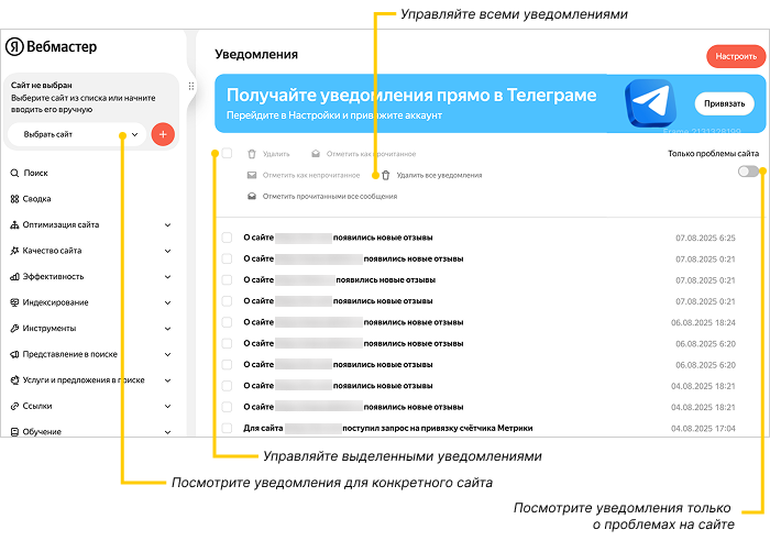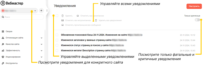 В Яндекс Вебмастере вы можете отдельно отслеживать страницы сайта, которые считаете наиболее важными и получать уведомления об их изменениях в поиске.