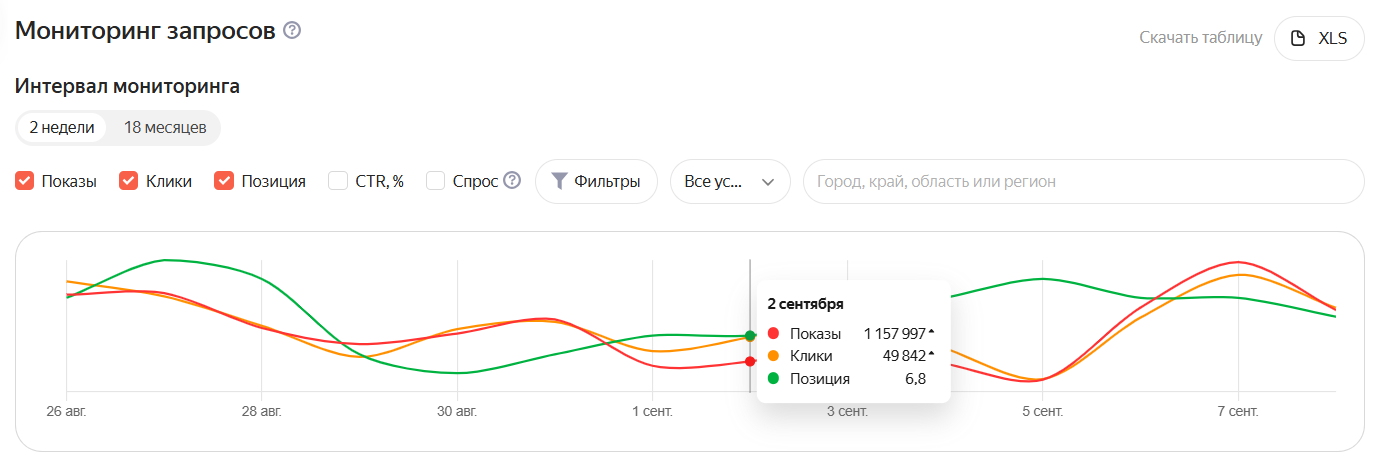 - Выберите показатель Спрос и посмотрите динамику популярности запросов. Для удобства можно использовать выгрузку в формате XLS.