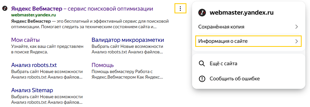 Перейти на страницу Информация о сайте также можно из результатов поиска — в сниппете сайта нажмите
