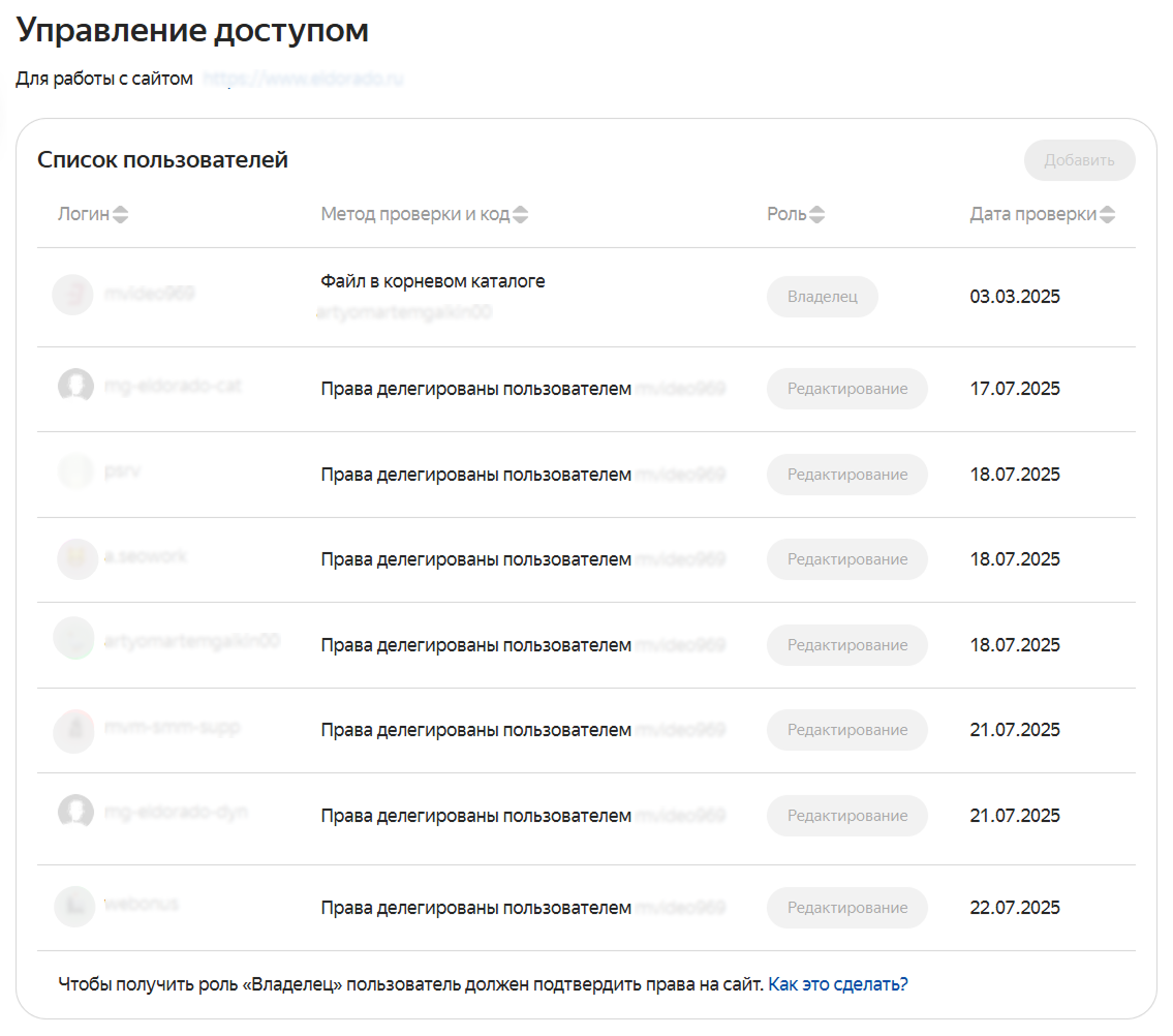 Когда вы подтвердите права на сайт, вы получите роль Владелец и полный доступ к управлению сайтом в Яндекс Вебмастере. Также вы сможете выдавать права доступа другим пользователям.