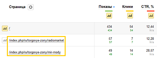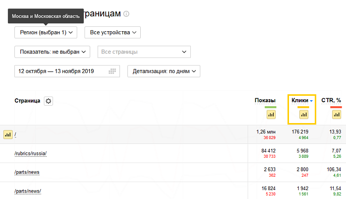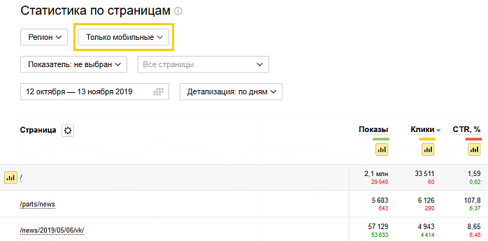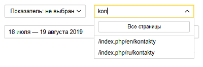 При просмотре отчета по выбранной странице в нем отобразятся все показатели, доступные в Вебмастере.