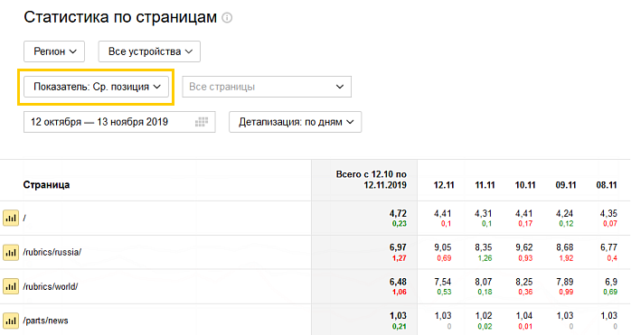 Выберите из списка показатель, по которому хотите построить отчет. Например, средняя позиция.