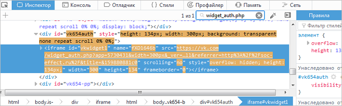 Чтобы найти кликджекинг на сайте, необходимо выявить фрагменты кода, отвечающие за скрытые элементы. Для поиска вам требуется авторизоваться в социальной сети и использовать консоль (веб-консоль) браузера.