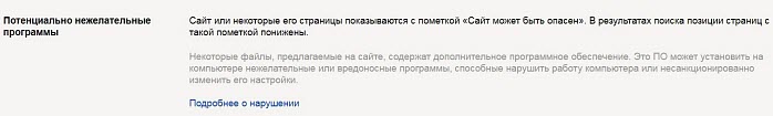 Сообщение в Вебмастере и пометка в результатах поиска появляются, если на сайте были обнаружены опасные или нежелательные файлы программ, или ссылки на подобные программы, которые устанавливают на компьютер дополнительное программное обеспечение без явного согласия пользователя. Например, программы-обертки.