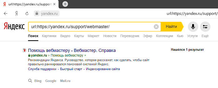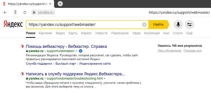 Проверьте, показываются ли страницы в поиске. Для этого на Яндексе введите в строку поиска URL страницы, которую нужно проверить: