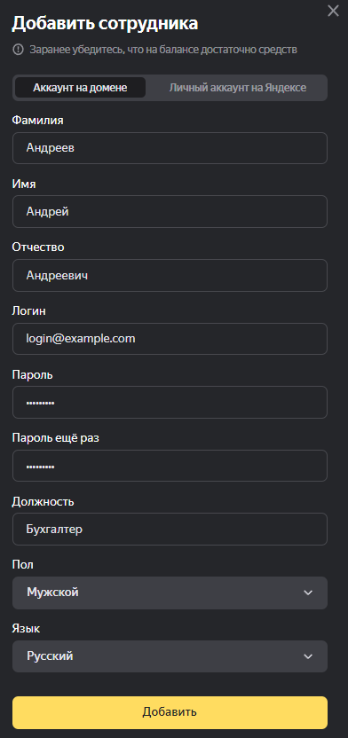 Ұйымға домен қосылған болса және балансыңызда жаңа пайдаланушыларды есептегенде тарифты төлеу үшін қаражатыңыз жеткілікті болған жағдайда ғана пайдаланкшылардың аккаунттарын жасай аласыз.