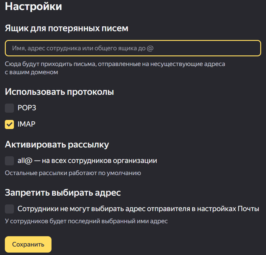 admin.yandex.kz бетін ашып, Пошта → Реттеулер тармағын таңдаңыз.