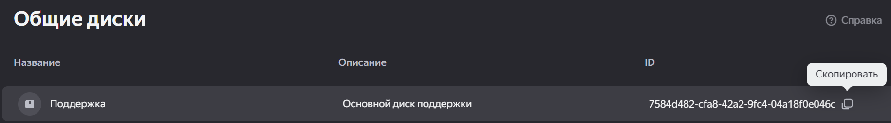 yandex_disk_id— файлдарды көшіргіңіз келетін ұйымыңыздың ортақ дискісінің идентификаторы. Оны Ортақ дискілер бөлімінде көшіріп алуға болады: