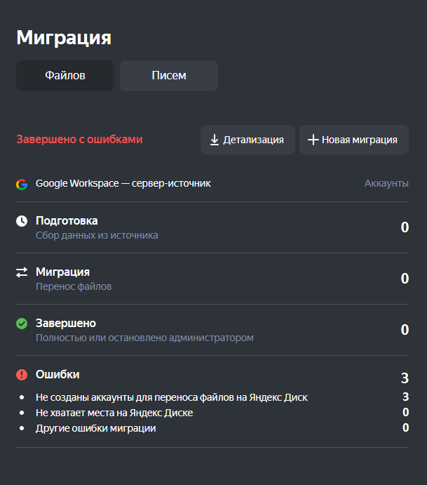 Если в отчете много аккаунтов с такой ошибкой, запустите миграцию заново (нажмите кнопку Новая миграция). Если проблема с некоторыми аккаунтами: