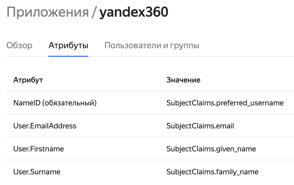 На странице настройки SAML-приложения перейдите во вкладку Атрибуты.