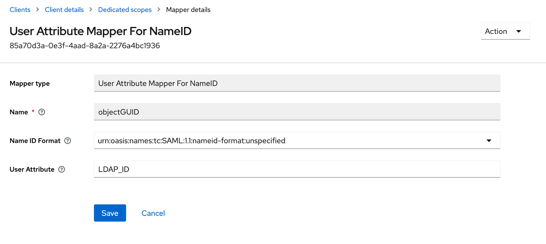 После этого атрибут objectGUID будет использоваться в качестве уникального идентификатора пользователя в LDAP-каталоге, а на стороне Keycloak он будет храниться в поле LDAP_ID.