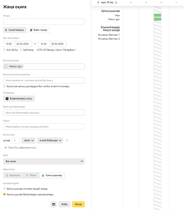 Қатысушыларды шақырыңыз. Егер адам кездесуге міндетті түрде келу керек болса, оны Қатысушылар өрісінде көрсетіңіз. Егер шақырылған адамның аты қызыл түспен жанып тұрса, ол бұл уақытта бос емес. Егер сары түспен жанып тұрса, бұл кезде басқа кездесуде болуы мүмкін. Қатысушылардың кестесін қарап, бәрі үшін жарамды уақытты таңдау үшін Толық формаға өту батырмасын басыңыз.
