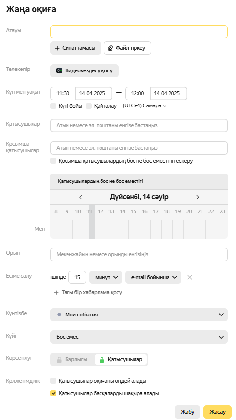 Егер сіз күнтізбені басқа пайдаланушылармен бөліссеңіз, оқиға туралы ақпарат бөліскендердің барлығына қолжетімді болады. Бірақ сіз іс-шараны жабық ете аласыз, сонда бұл туралы ақпарат тек оның қатысушыларына немесе сіздің ұйымыңыздың қызметкерлеріне қолжетімді болады. Ол үшін Қатысушылар немесе Ұйым көрінімділік опциясын қосыңыз.