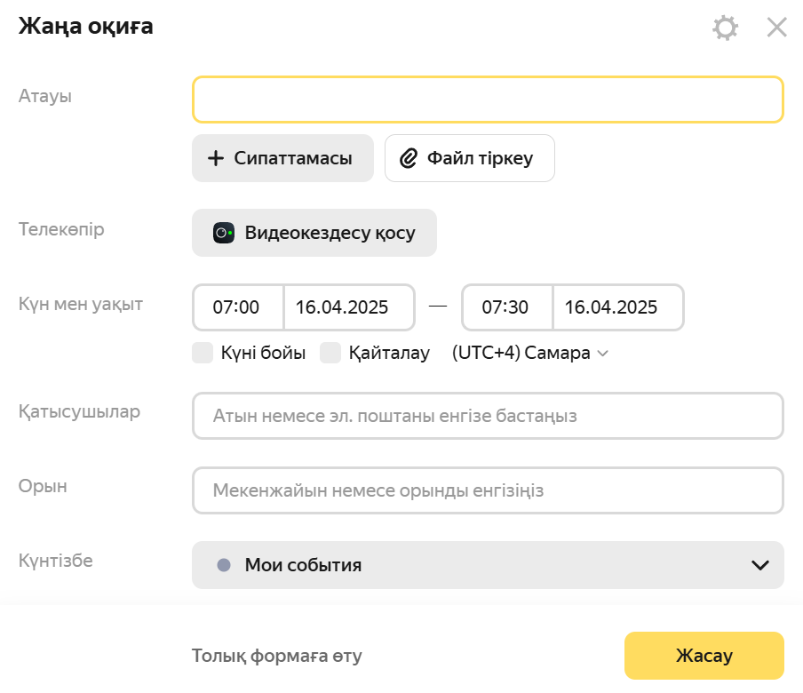Күнтізбенің торында қажетті күн мен уақыт тұрған өріске басыңыз. Оқиғаларды жасаудың қысқаша формасы ашылады. Төменде Толық формаға өту батырмасын басыңыз. Оқиғаны жасаудың толық формасы ашылады. Сондай-ақ, сіз толық форманы сол жақ панельдегі Оқиға жасау батырмасына басу арқылы бірден аша аласыз.