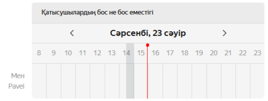 Егер шақырылған адам келе алмайтынын белгілесе, онда оның аты немесе мекенжайы қызыл немесе сары түске боялады, ал төмендегі блоктан қатысушы қай кезде бос емес екенін қарай аласыз. Уақытты таңдау үшін кестеде қажетті кезеңге басыңыз.