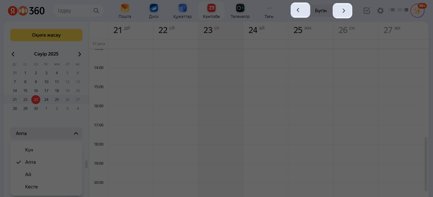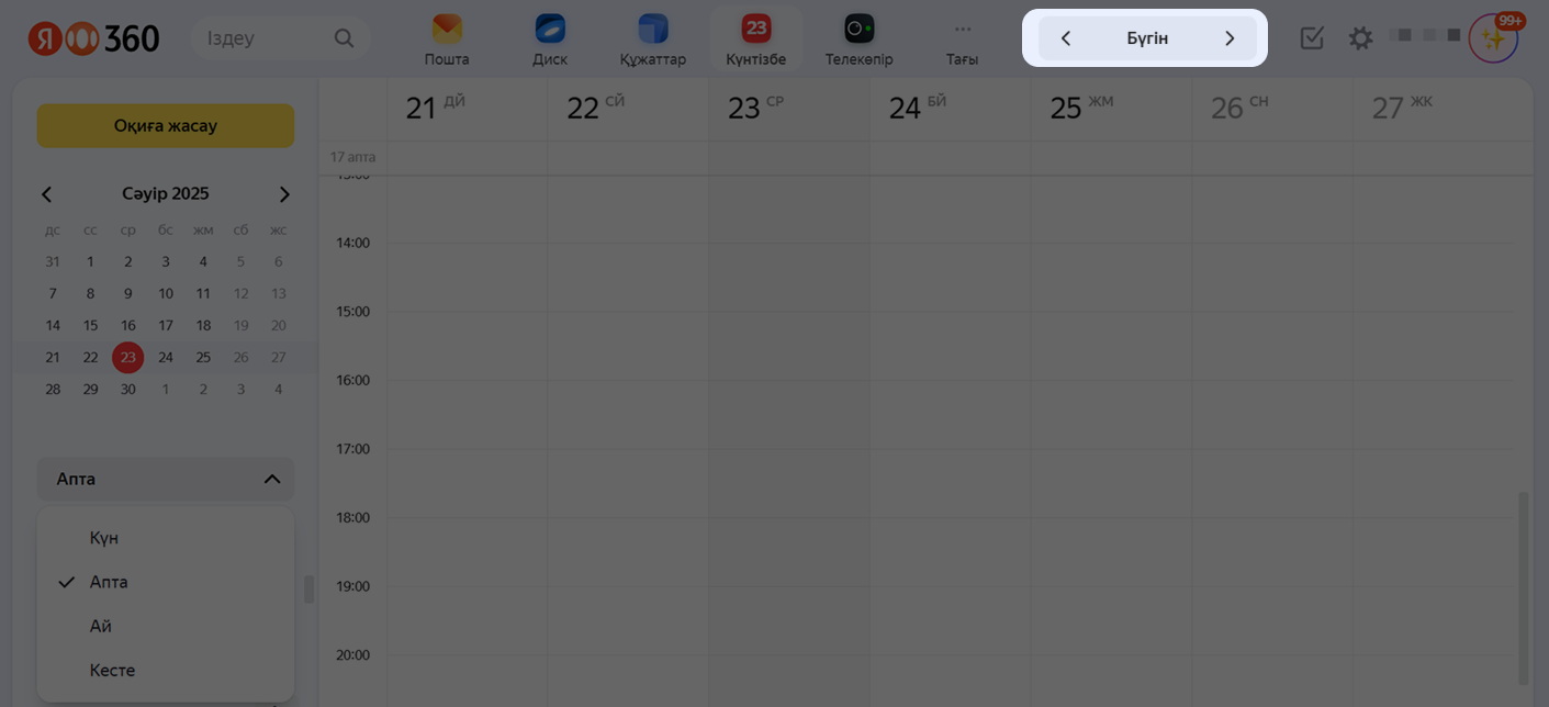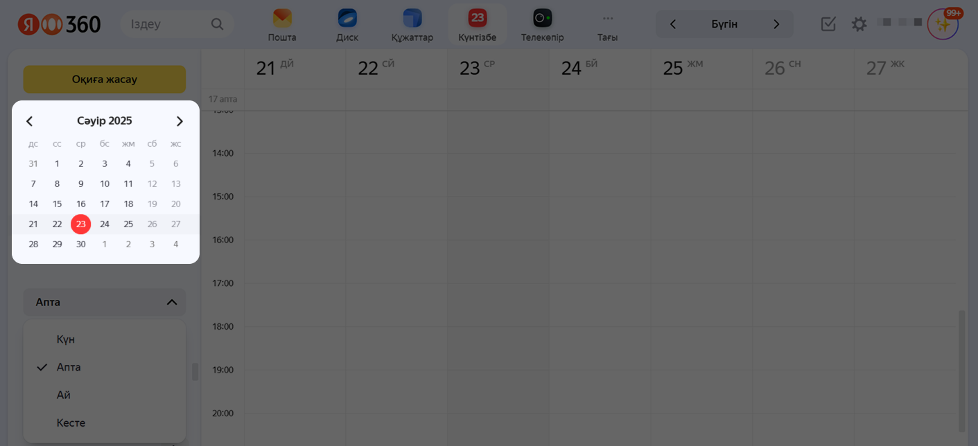 Әдепкі түрде экранда ағымдағы аптаға арналған күнтізбе көрсетіледі. Бір күн, бір ай үшін немесе Кесте режимінде оқиғаларды көрсету үшін сол жақтағы панельдегі аспа тізімнен көрінісін таңдаңыз: