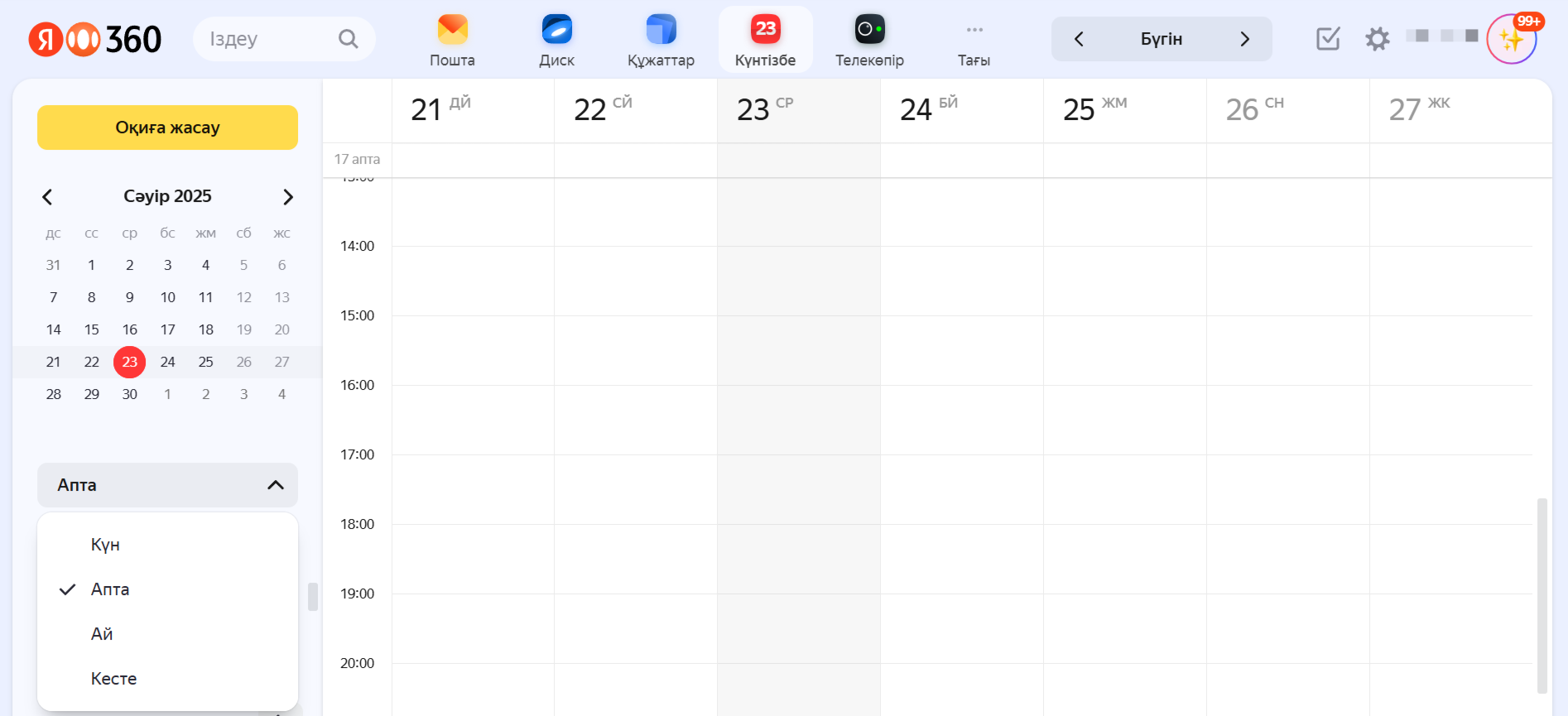 Әдепкі түрде экранда ағымдағы аптаға арналған күнтізбе көрсетіледі. Бір күн, бір ай үшін немесе Кесте режимінде оқиғаларды көрсету үшін сол жақтағы панельдегі аспа тізімнен көрінісін таңдаңыз:
