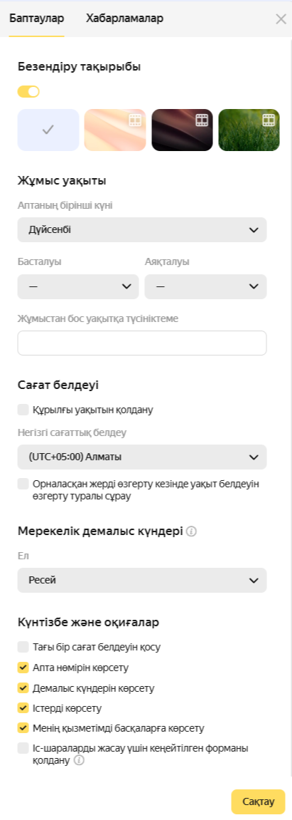 Баптаулар қойындысында түрлі-түсті безендіру тақырыбын таңдауға болады — ол Күнтізбеде, Пошта, Диск, Телемост мен Құжаттарда көрініс табады. Кескін анимацияланған болу үшін Видеофондарды ойнату опциясын қосыңыз.