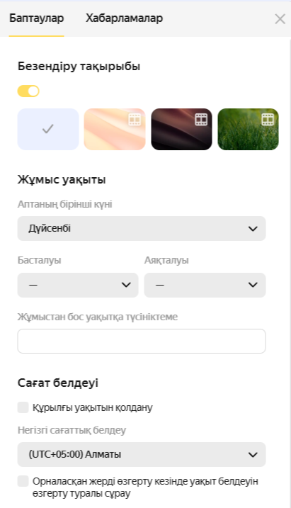 Жұмыс уақыты бөлімінде өзіңіз жұмыс істейтін күндер, уақыт пен сағат белдеуін көрсетуге болады. Бұл графикті өндірістік күнтізбе бойынша демалыстармен толықтыруға болады — ол үшін Мерекелік демалыс күндері бөлімінде өзіңіз жұмыс істейтін елді немесе Ресей аймағын көрсетіңіз. Егер әріптесіңіз сізді демалыс немесе мереке күні кездесуге шақырса, ол сіздің қолжетімсіз болуыңыз мүмкін екенін көреді.