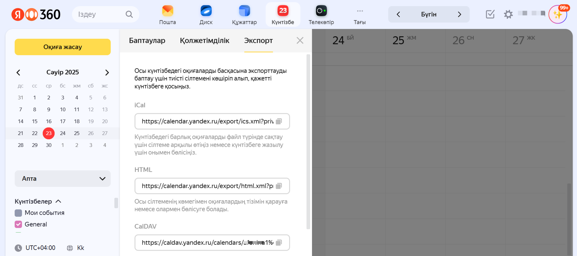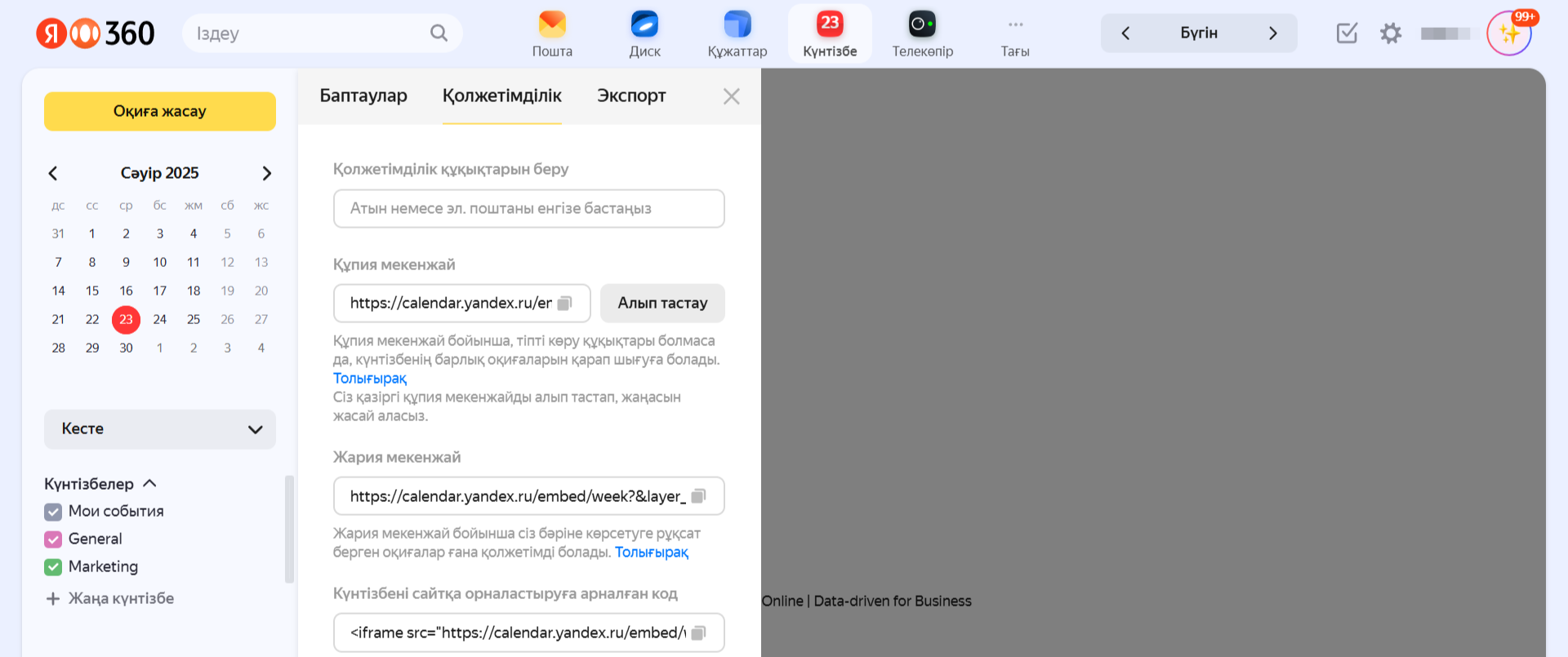 Сіз Яндекс Күнтізбедегі оқиғаларды басқа сайттағы күнтізбеге көшіре аласыз немесе өз күнтізбеңіздегі оқиғаларды басқаларға файл немесе сілтеме арқылы жібере аласыз.
