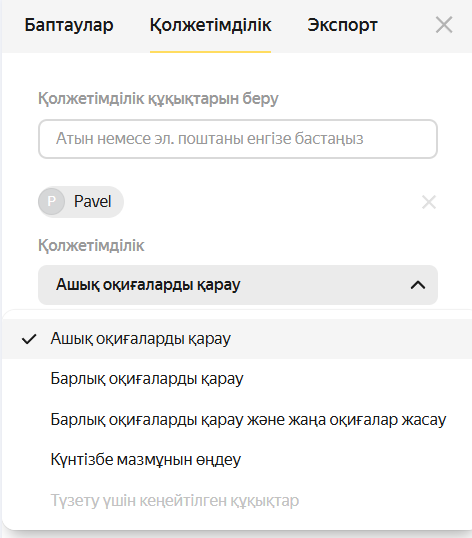 Сіз әріптестеріңіз үшін күнтізбеге рұқсат бере аласыз. Егер сіздің ұйымыңыздың әкімшісі топтар мен бөлімшелерді баптаған болса, сіз олардың бүкіл қатысушыларына бірден қолжетімділік бере аласыз. Рұқсат алғаннан кейін олар сіздің күнтізбеңізді өз Яндекс Күнтізбесінен қарай алады.