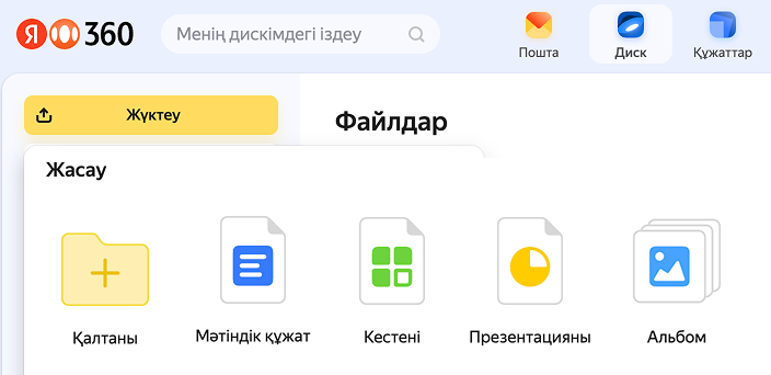 Құжаттарды, кестелерді және презентацияларды тікелей Яндекс Дискіде жасап өзгерте аласыз.