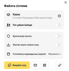 - Файлды немесе қалтаны жүктеп алуға тыйым салыңыз (Қарау рұқсат деңгейі үшін) — осы сілтеме арқылы өткен соң, Жүктеп алу, Яндекс Дискіге сақтау және Басып шығару батырмалары басқаларға қолжетімді болмайды. Құжатты тек жария беттен қарауға болады.