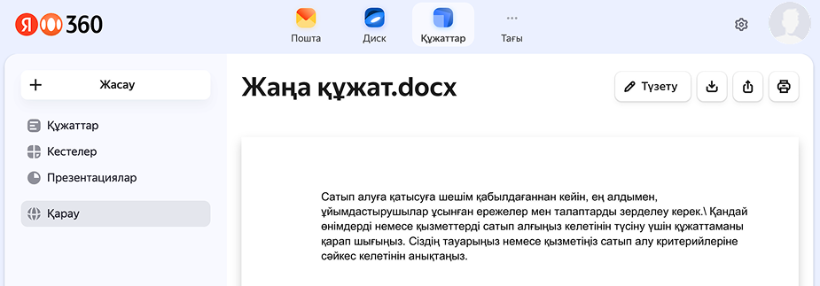 Дискіге жүктеген немесе сақтаған файлдарды Диск веб-интерфейсінде қосымша бағдарламалар орнатпай-ақ қарауға болады. Файлдың келесі форматтарына қолдау көрсетіледі: