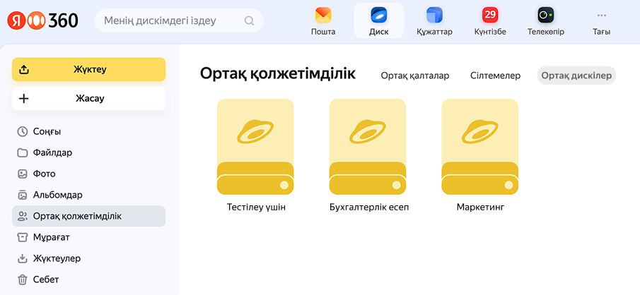 Назар аударыңыз: ортақ дискілер тек Дискінің веб-нұсқасында disk.yandex.kz бетінде қол жетімді. Мобильді қолданбада және компьютерге арналған бағдарламада мұндай функционал жоқ.