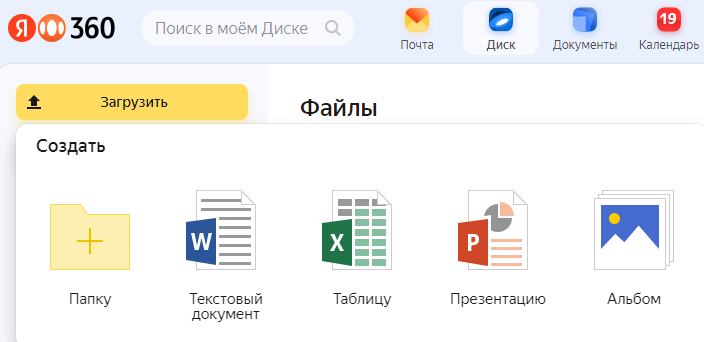 Чтобы создать новый документ, таблицу или презентацию, на панели слева нажмите кнопку Создать и выберите тип файла. Также вы можете создать документы с помощью контекстного меню.