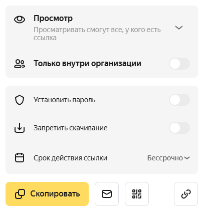 Запретите скачивание файла или папки — после перехода по такой ссылке кнопки Скачать и Сохранить на Яндекс Диск будут недоступны для других. У документов также будет недоступна печать, а у аудиофайлов — прослушивание из Диска.