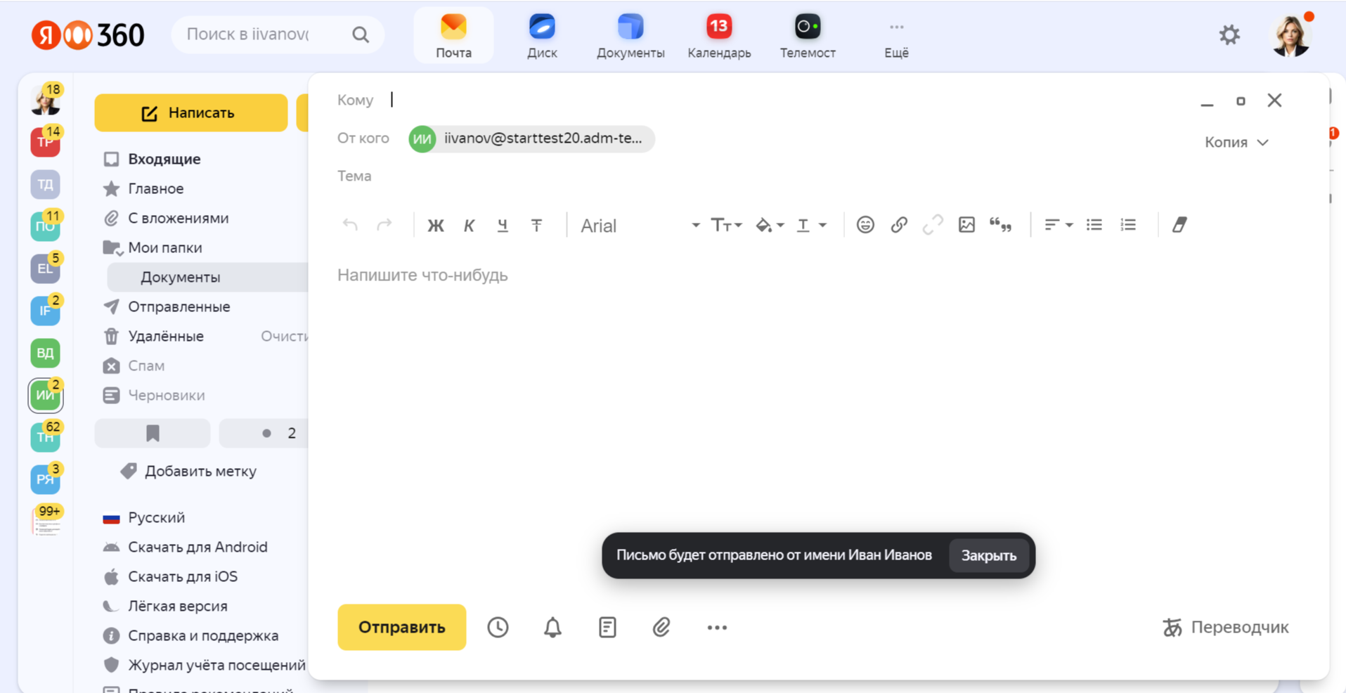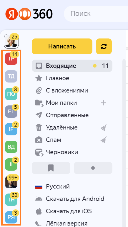 Поштаның веб-интерфейсінде қосымша баптаудың қажеті жоқ: әкімші сізге ортақ немесе табысталған жәшіктерді пайдалануға рұқсат бергеннен кейін, олар қалталар тізімінің сол жағында пайда болады.