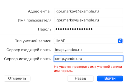 Если программа не может определить параметры сервера, вы увидите сообщение Не удается проверить имя учетной записи или пароль.