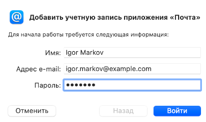- Имя пользователя — ваш почтовый адрес, например, «igor.markov@example.kz»;