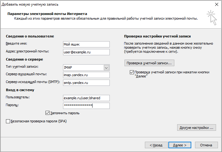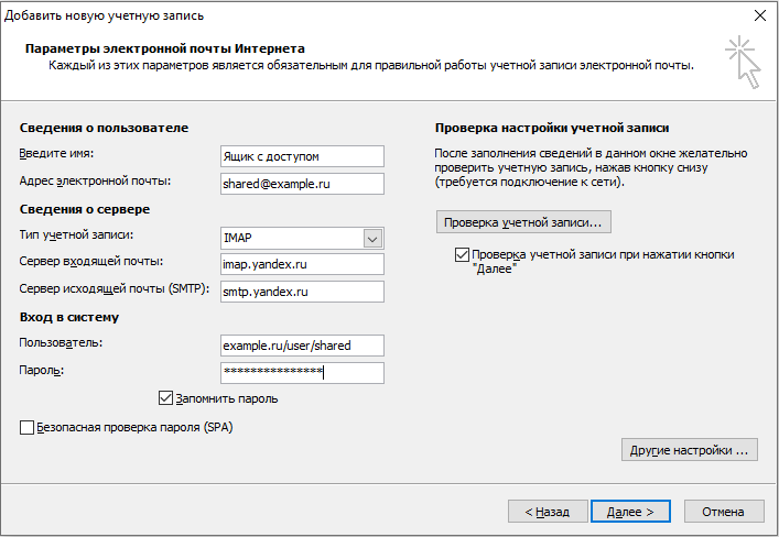 В разделе Сведения о пользователе укажите данные ящика, к которому вам предоставили доступ: