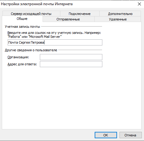 На вкладке Общие введите имя подключаемой учетной записи. Это имя вы будете видеть у себя в списке доступных ящиков.