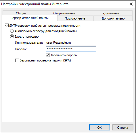 Если вам разрешена отправка в режиме «Отправить как», на вкладке Сервер исходящей почты включите опцию SMTP-серверу требуется проверка подлинности, выберите значение Вход с помощью и заполните поля: