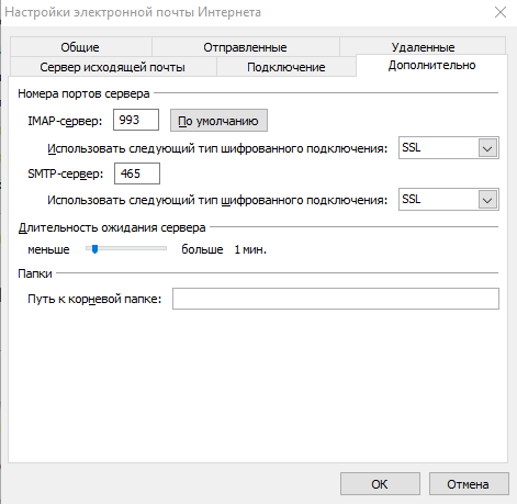 В окне Настройка имеющейся у вас учётной записи электронной почты укажите следующие параметры: