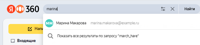 Если вы не помните имя контакта полностью, начните его вводить — Почта подскажет подходящие варианты. Также в подсказках Почты будут появляться ваши прошлые запросы.