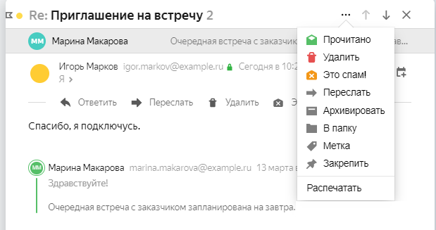 В цепочке писем вы можете управлять всеми письмами цепочки сразу — например, пометить все прочитанными, удалить или переслать. Для этого нажмите кнопку