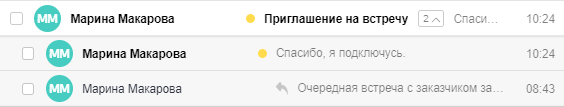 → Группировка писем в цепочки. Ваши письма сгруппируются в цепочки писем. Чтобы свернуть или развернуть список писем в цепочке, нажмите на строку с темой письма. Чтобы просмотреть любое письмо из цепочки, нажмите на строку с этим письмом.