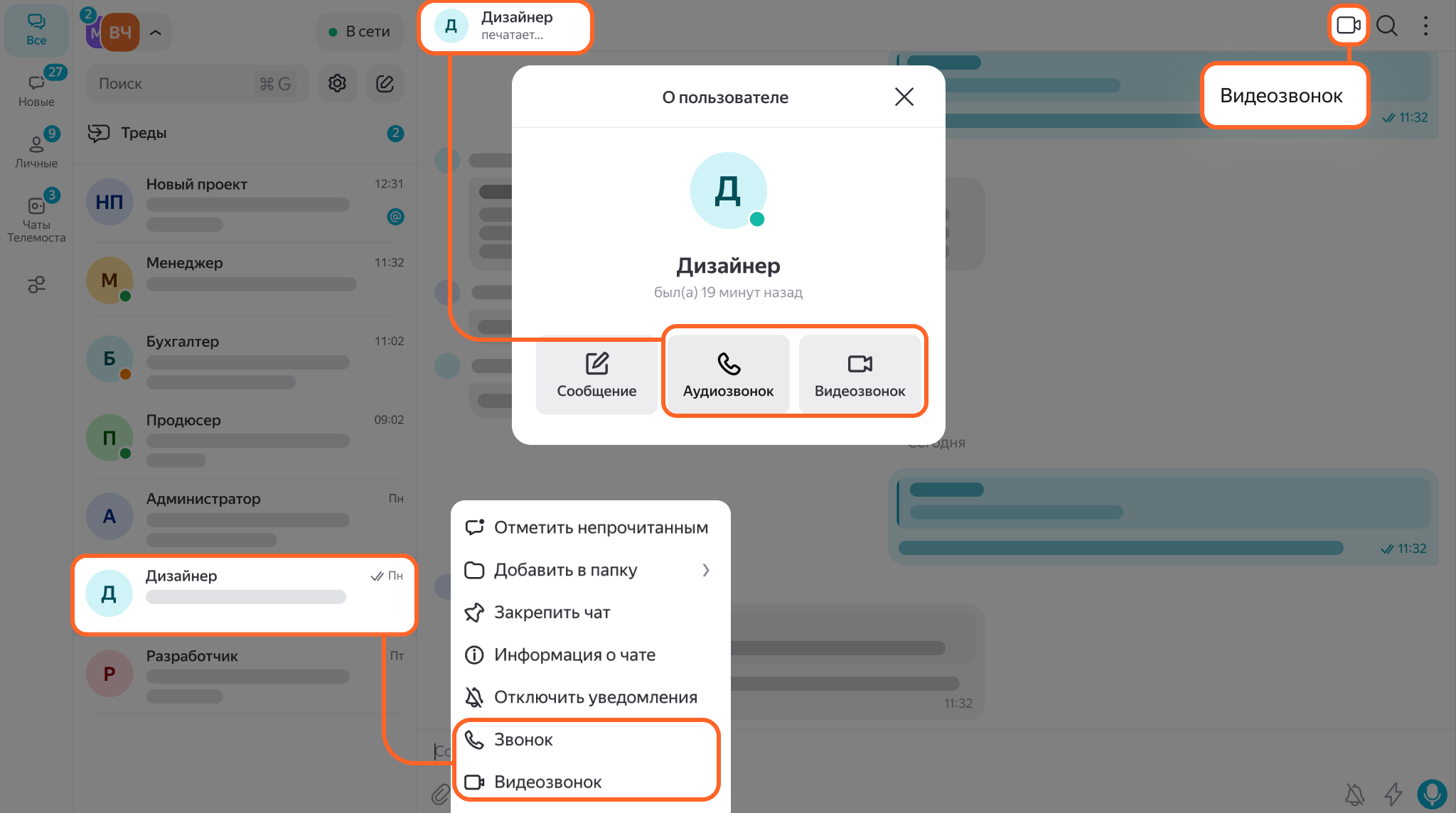 Если нужно обсудить вопрос голосом, вы можете позвонить собеседнику прямо в Мессенджере — с видео или без.