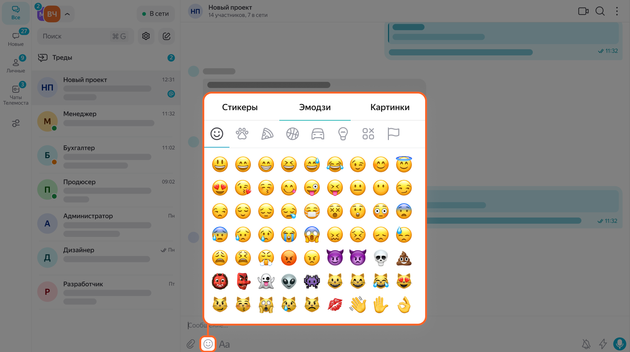 В Мессенджере можно выразить эмоции или оживить переписку с помощью реакций, стикеров, эмодзи и картинок. Реакции крепятся к уже отправленным сообщениям. Стикеры, эмодзи и картинки можно отправлять как отдельные сообщения.